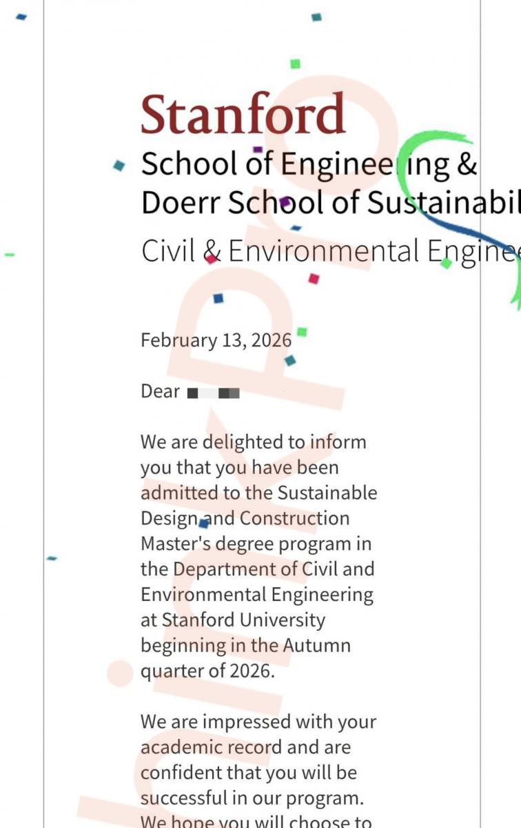 6年前,帮学生转到了全美建筑前三的Cal Poly SLO。今年,帮她拿下斯坦福的Sustainable Design and Construction研究生!