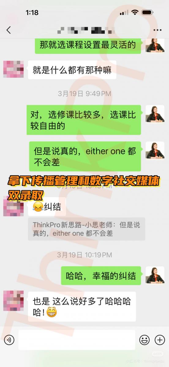 第一个学生,申请传播管理专业。一所社区大学成绩单,USC一直没收到。她邮箱又出了问题,一直没看到学校通知,结果申请直接被取消了。天塌了,因为USC是梦校啊!我们马上介入、指导学生和学校沟通,最终成功恢复申请。之后,更是顺利拿下这个专业的录取,还收获了Digital Social Media双录取!