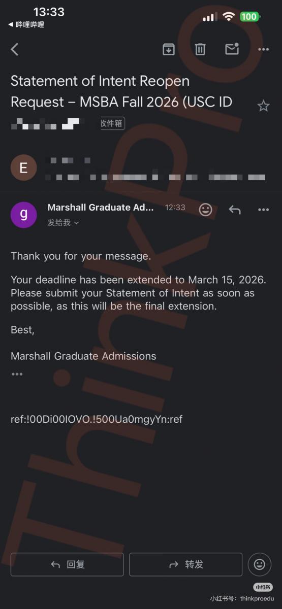 第二个学生,我们早早就帮他拿到了商学院商业分析MSBA录取,但因为还想等等其他学校,一不小心错过了确认入学缴纳定金的截止日期。虽然就错过一天,但网页也关闭了。关键时刻冷静处理,指导学生与学校沟通,最终成功争取到延期一个月!