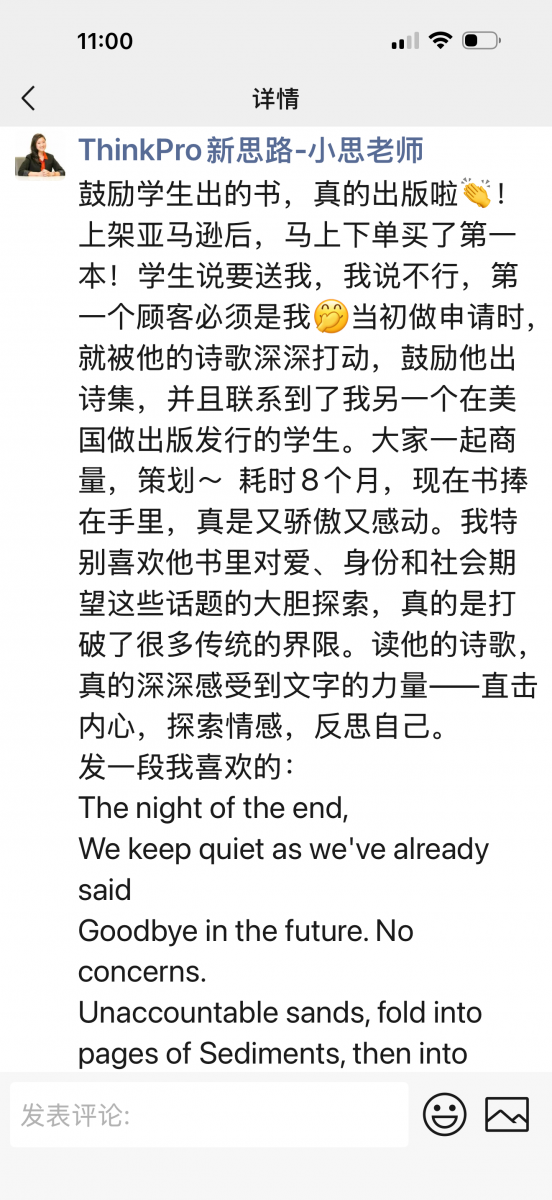 被学生感动到想哭。为什么我的学生都这么好,这么有才!帮学生转学到USC南加州大学,并在我的鼓励和帮助下,他出了自己的第一本诗集。