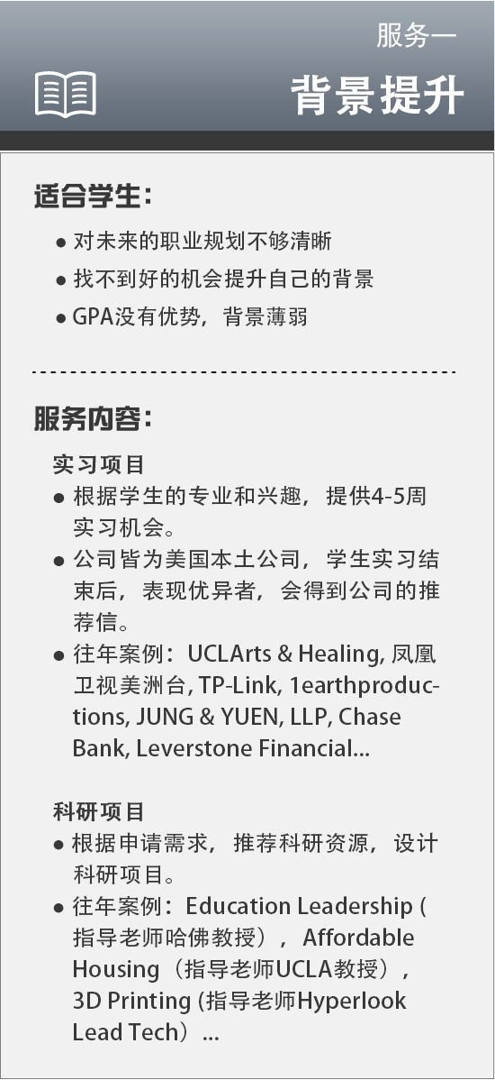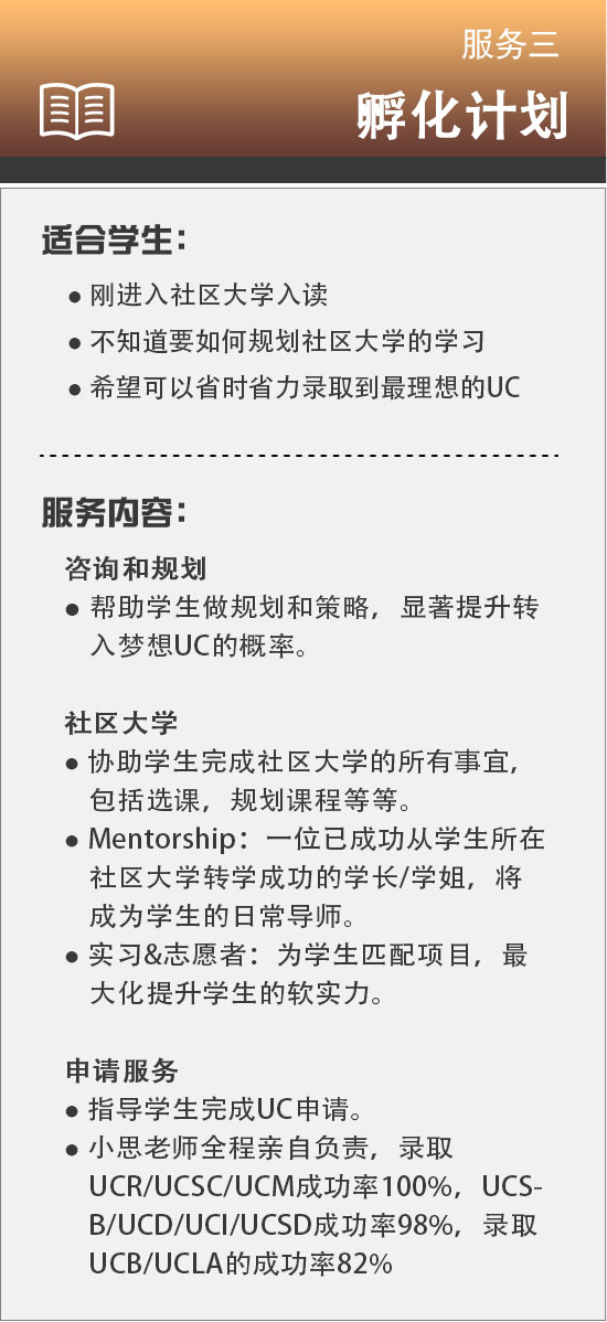 多年UC各分校申请经验,为每位学生匹配相对应专业的老师,深度挖掘学生背景,打造个性化精品申请材料。专业的知识+用心的态度=每年录取率95%。